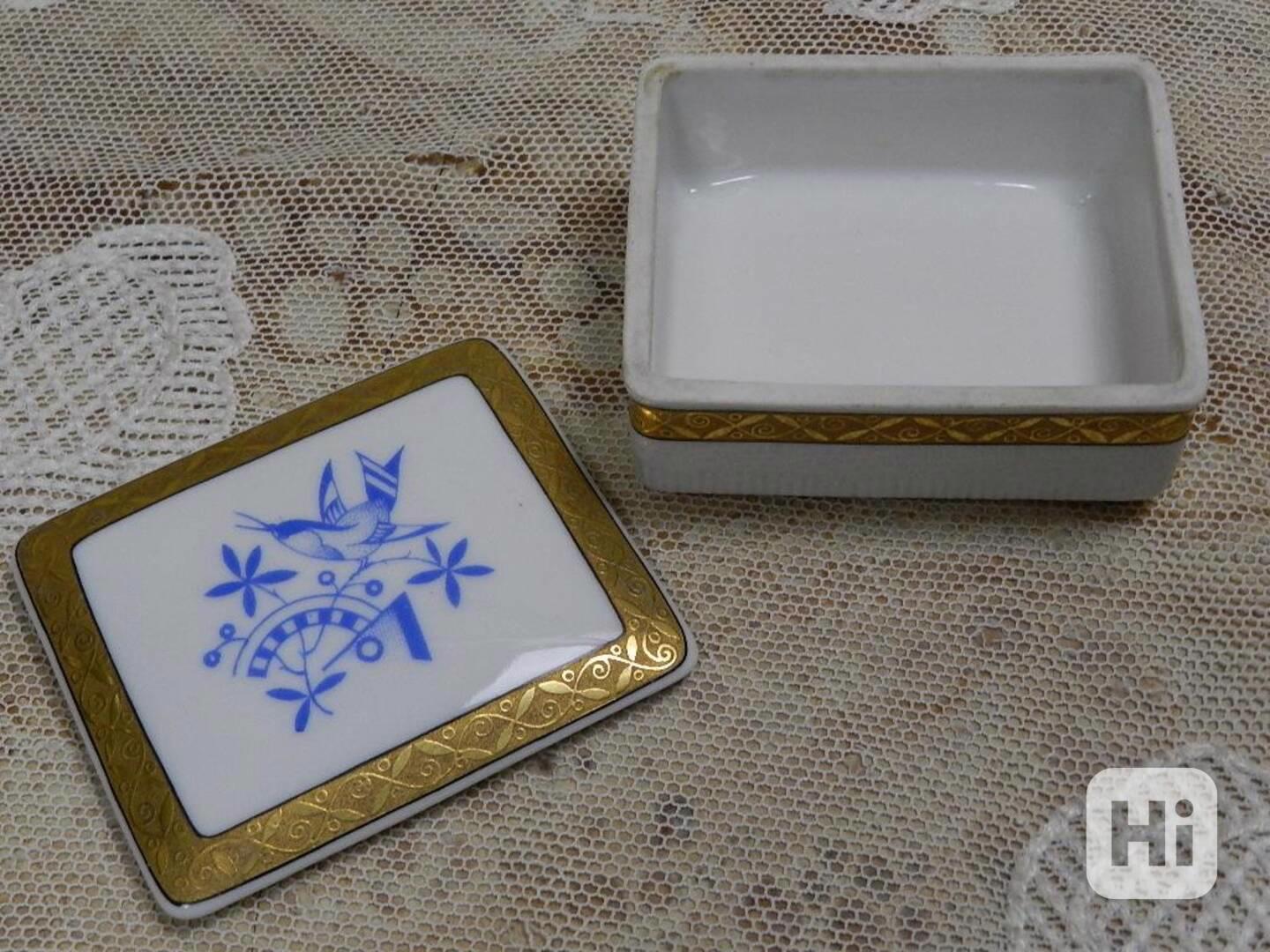 Zajímavá porcelánová zlacená Dóza s ptáčkem - PirkenHammer Czechoslovakia, Staats Fachschule Karlsbad.Rozměry: výška 4cm, 9-7,5cm.
