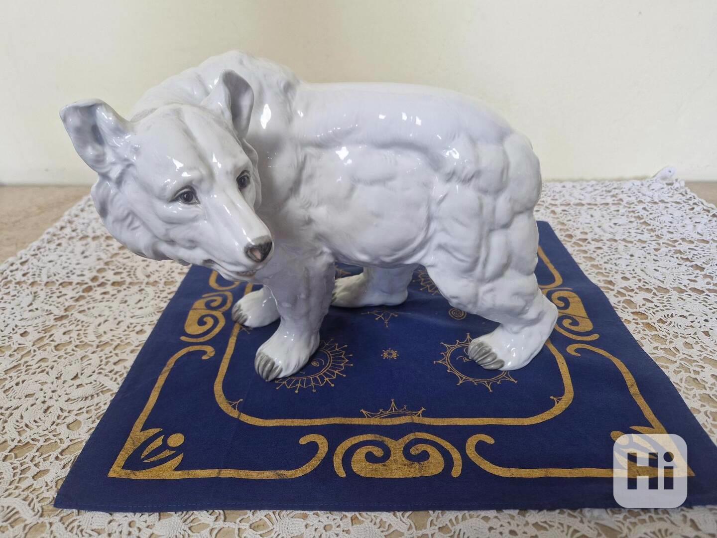 Vzácná masivní porcelánová plastika, Medvěd Grizzly, malba na bílé barvě - Horní Slavkov, Jubilejní zlatá značka 1932-1935.