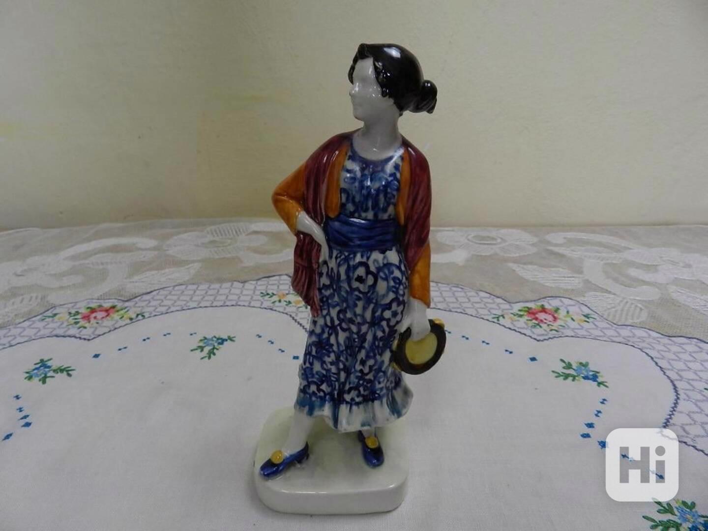 Žena s tamburínou, ruční malba, glazovaná keramika - Wiener Kunstkeramische Werkstatte, 1 třetina 20 stol.