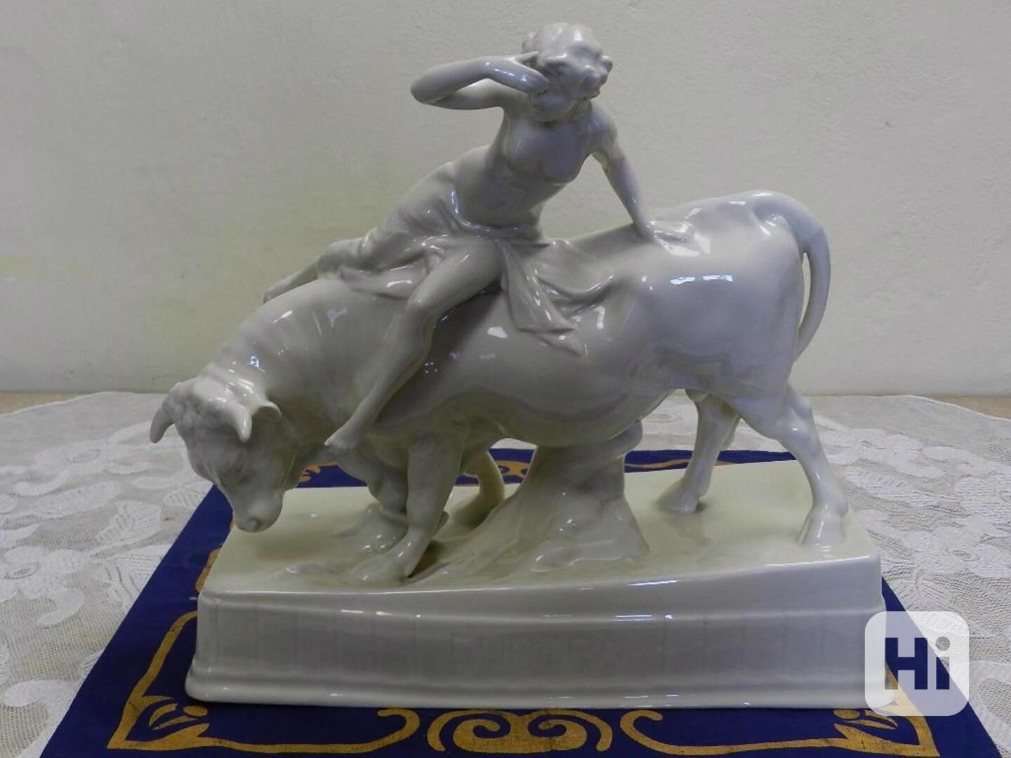Krásná Art Deco větší porcelánová Plastika, Únos Evropy, bílý glazovaný porcelán - Pirkenhammer, Březová, Signováno na soklu, kolem 20 až 30 let 20 stol.Rozměry: výška 32cm, šířka 36-17cm.