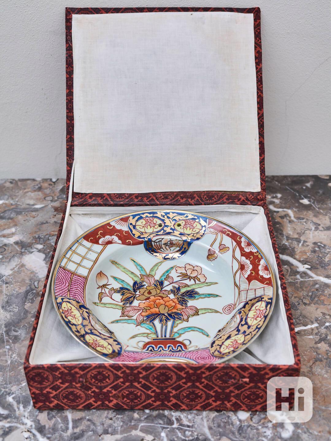 Ručně malovaný japonský porcelánový talíř Imari, původně určený jako holicí miska. Charakteristický výřez na okraji sloužil k pohodlnému přiložení k bradě během holení. Dekor je proveden v typických barvách Imari – červené, kobaltově modré, tyrkysové a zlaté, s motivem kytice ve váze a bohatým ornamentem po obvodu.