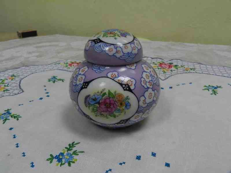 Hezká stará ručně malovaná fialová Dóza s motivy květin - Fraureuth Germany, 1 čtvrina 20 stol.Rozměry: výška 10cm, šířka 9,5cm.